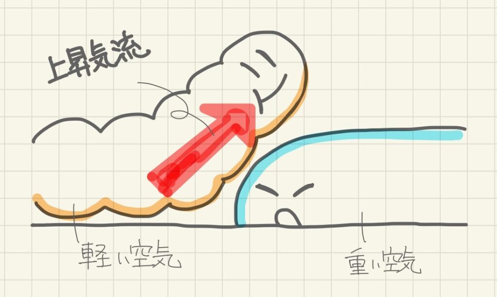 前線による上昇気流は、地形による上昇気流に似ていて、重い空気はいわば山のようなものだゾ⛰️