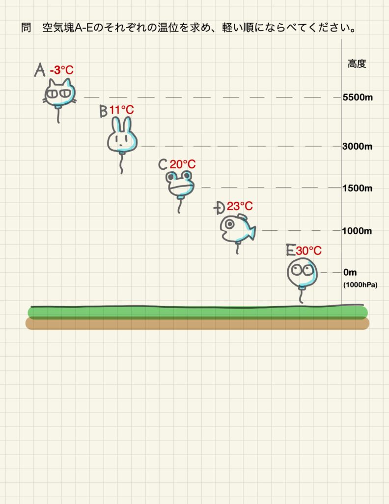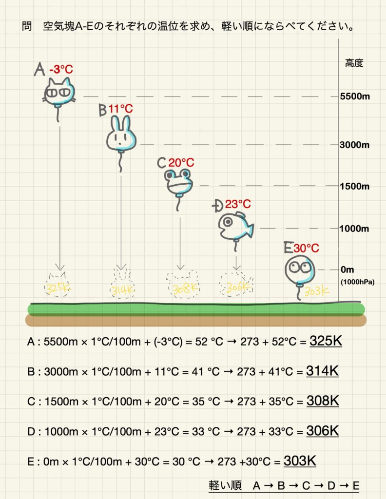 空気塊の軽さは、暖かさ(温位)で判断できることを学びました。