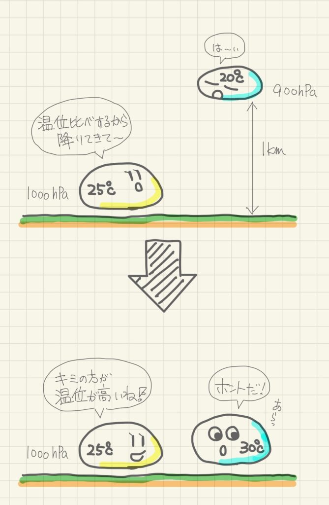 例えば、地表付近の25℃の空気塊と高度1km20℃の空気塊はどちらが温位が高い(空気が軽い)かを比べます。
