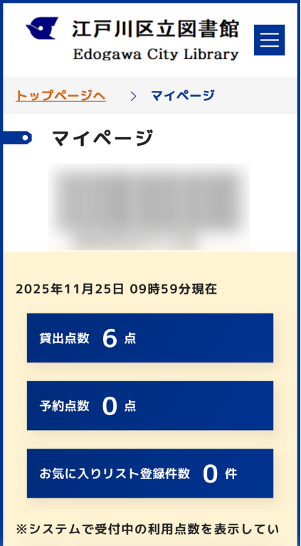 スマホで江戸川区立図書館のサイト(https://www.library.city.edogawa.tokyo.jp/toshow/index.php)にログインすると次のような画面が出てきます。バーコードが表示され、それを使って受付や無人貸出機で本を借りたり登録制の席を利用したりできます。