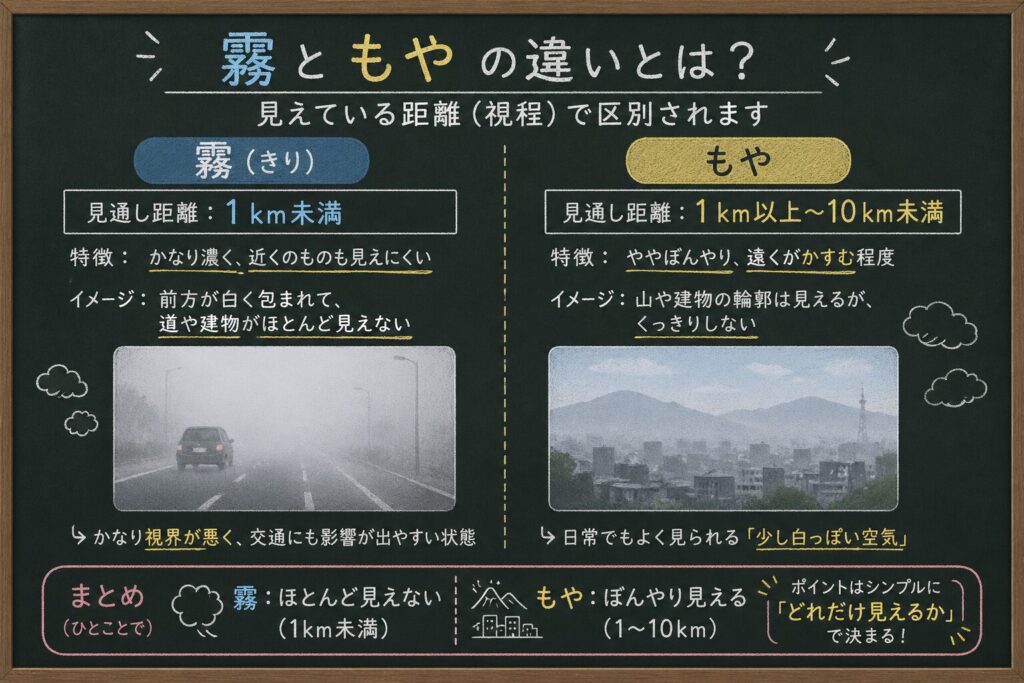 霧と「もや」は、どちらも空気中の小さな水滴が光を散乱して景色が白くぼやけた状態ですが、見えている距離(視程)で区別されます。