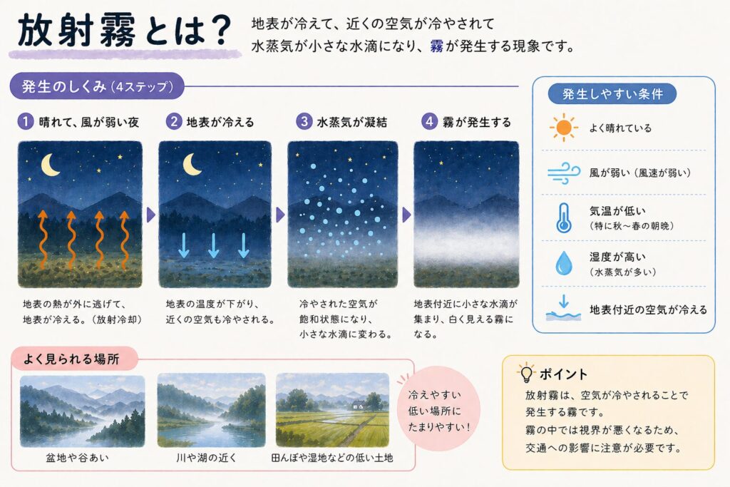 放射霧は、晴れて風が弱い夜から朝にかけて、地面が冷えて空気も冷やされるときに発生しやすいです。