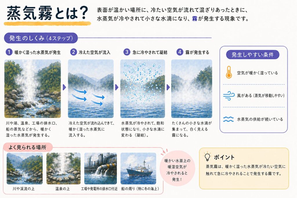 蒸気霧は、「表面が温かい場所に、冷たい空気が流れてきたとき」に発生する霧です。
