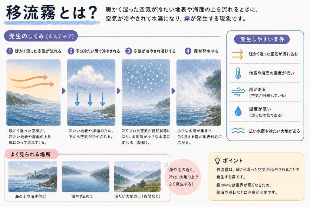 移流霧は、「空気の塊が冷たい場所に流れてくることで」できる霧です。特に海や湖によく見られます。