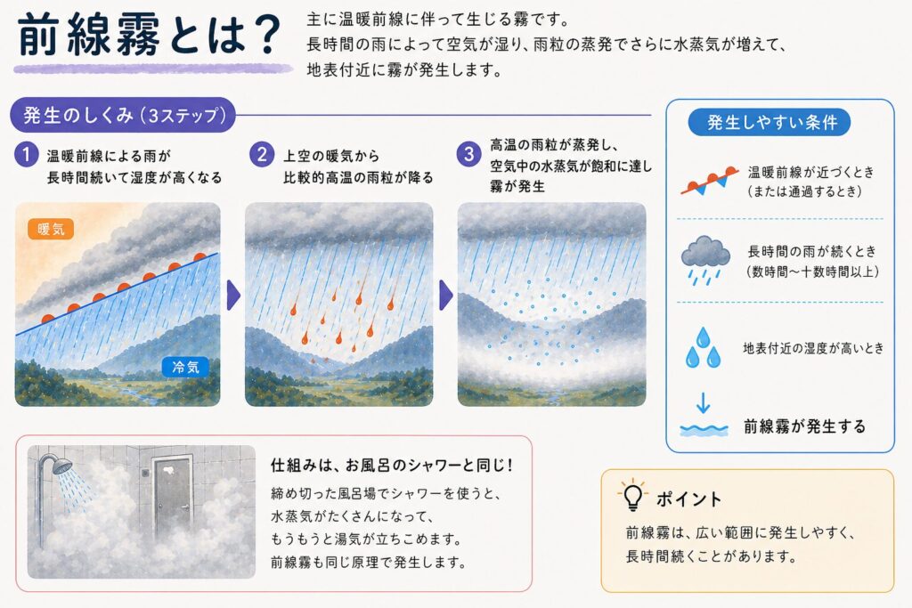 前線霧は、天気の前線(とくに温暖前線)の前後に発生しやすいタイプです。